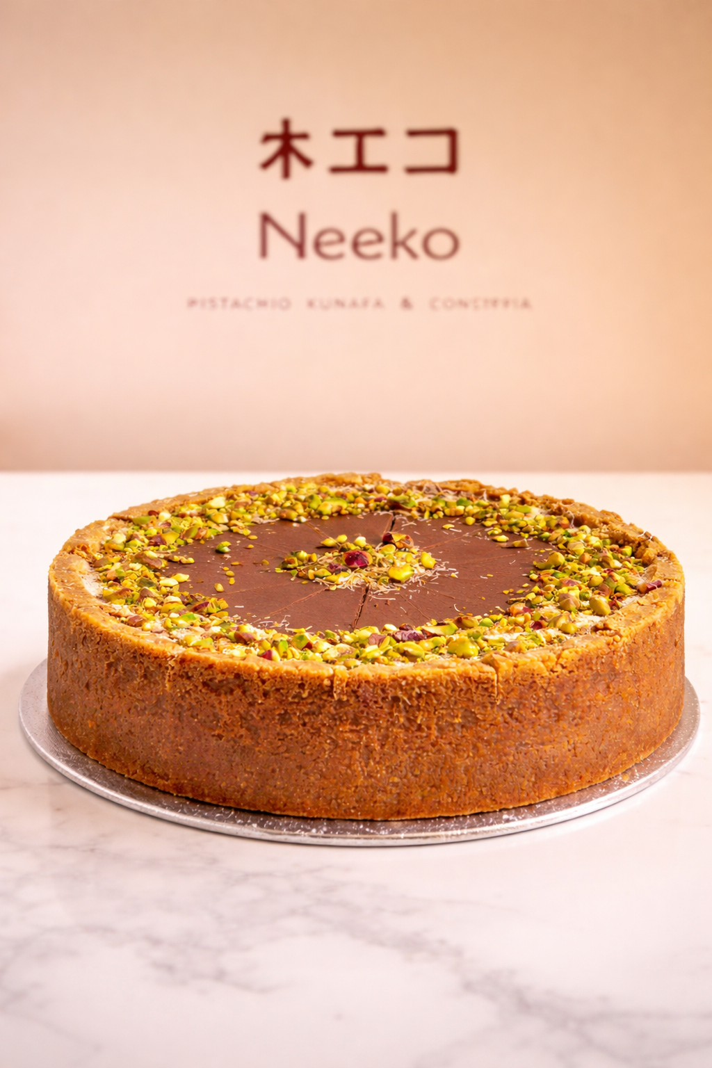 The creamy cheesecake base is topped with a crisp golden kunafa layer infused with premium pistachios, then finished with a delicate touch of milk chocolate for a smooth and luxurious finish. The contrast between the rich cheesecake filling and the crunchy pistachio topping creates a beautifully balanced dessert that is both elegant and satisfying.